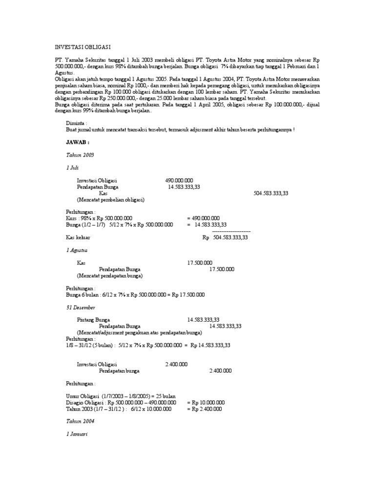 Pada tanggal 1 maret dibeli 15 lembar saham pt diva nominal at rp500000 kurs 101 biaya pembelian sebesar rp75000. Perhatikan contoh berikut tentang perhitungan bunga berjalan dan pencatatan obligasi sebagai berikut. Pada tanggal 01 juni 1990 dibeli 60 lembar obligasi darai ptsejahtera yang mempunyai nilai nominal rp 100000 setiap lembar dengan harga kurs 102.