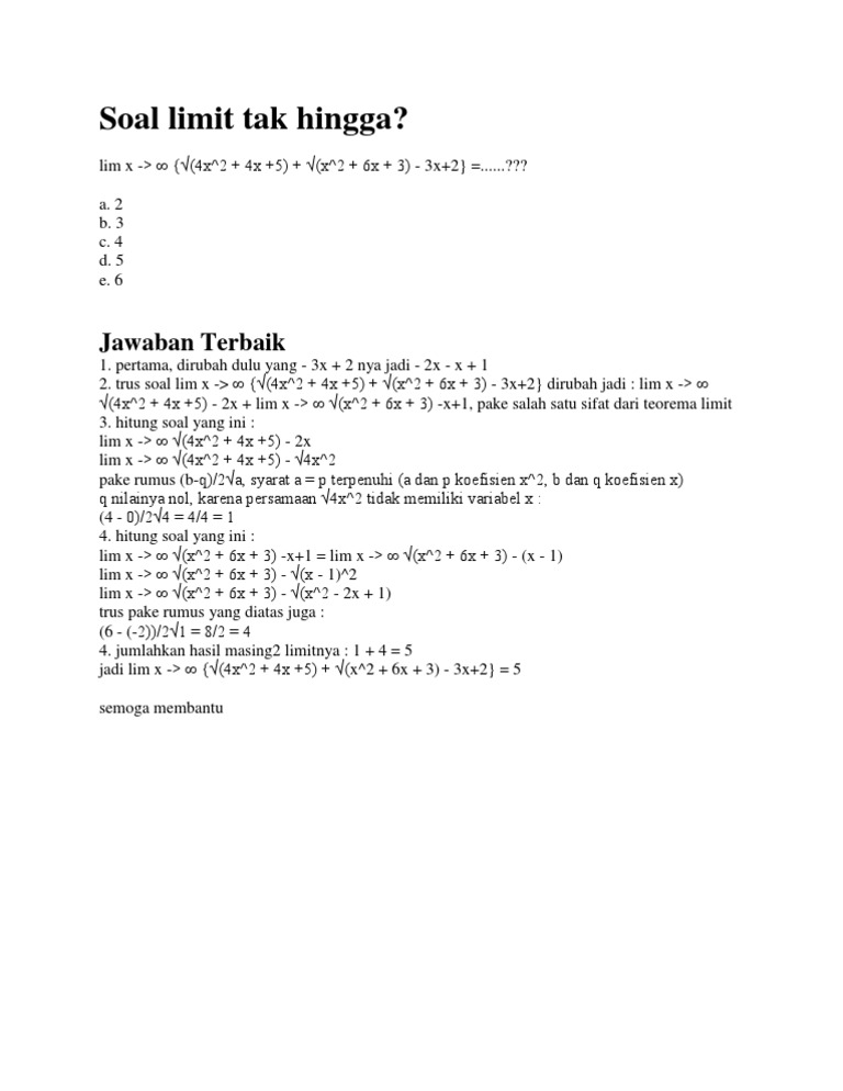 Tuliskan 20 Soal Dan Jawaban Tentang Limit Tak Hingga Limit Angka