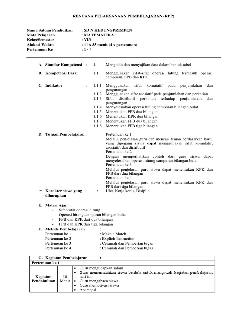 Rpp Matematika Kelas 6 Semester 1 Pertemuan 1 4 Docx